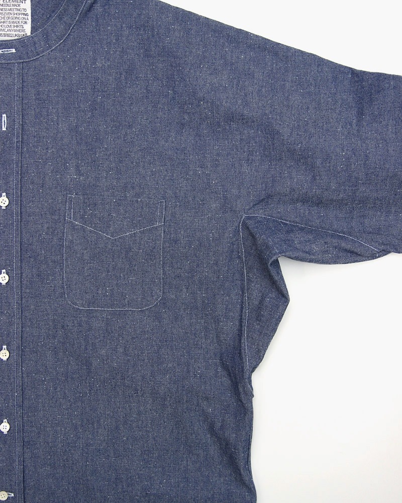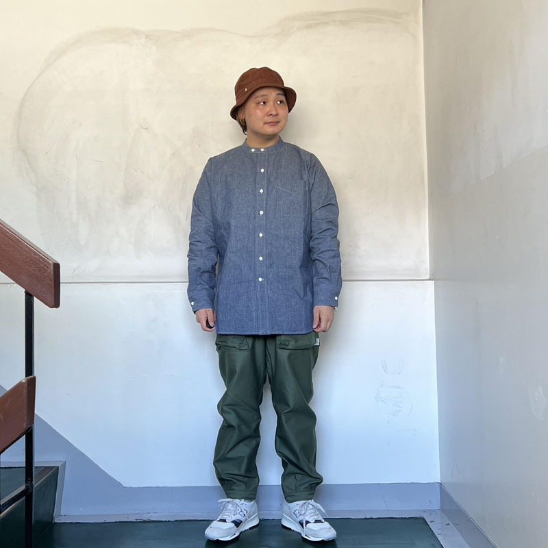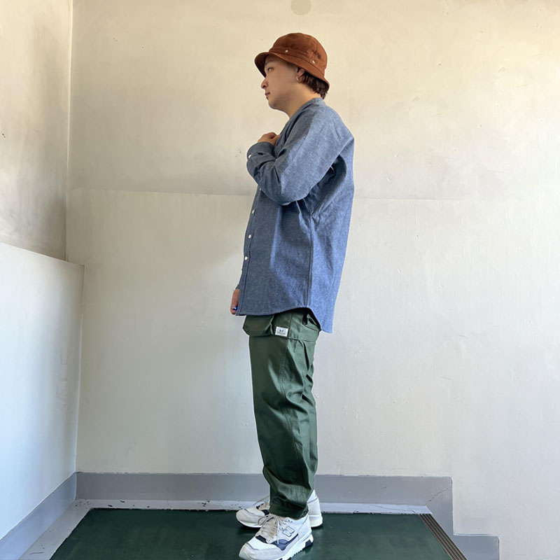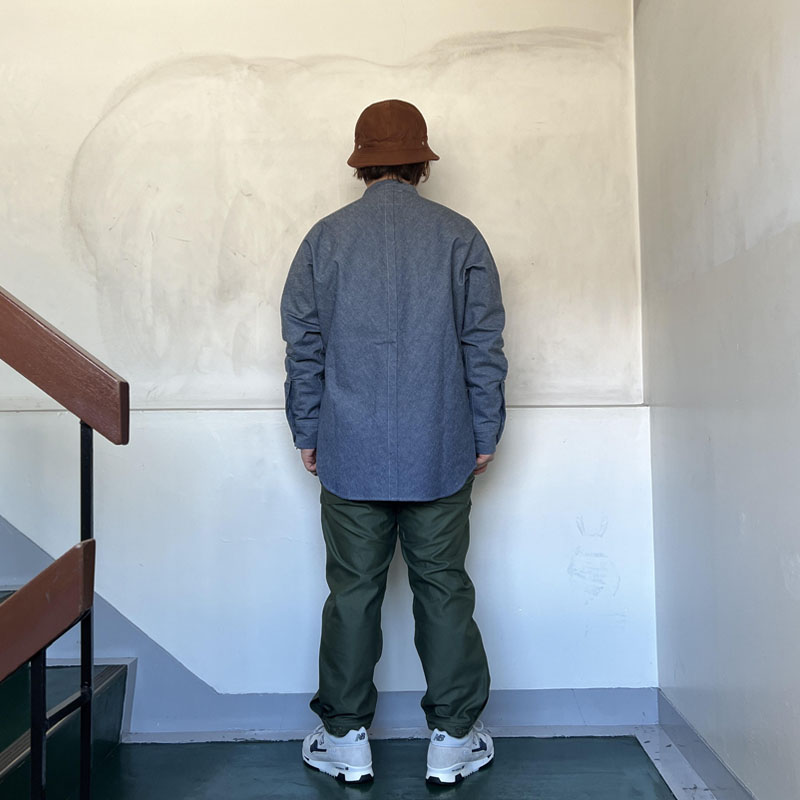 そして最大の特徴はそのパターンでワーク感の強いバンドカラーのチンストラップ仕様ですが、 ボディはバイアス使いする事でアーム周りの運動性を確保しながら見た目にも独特の存在感があります。