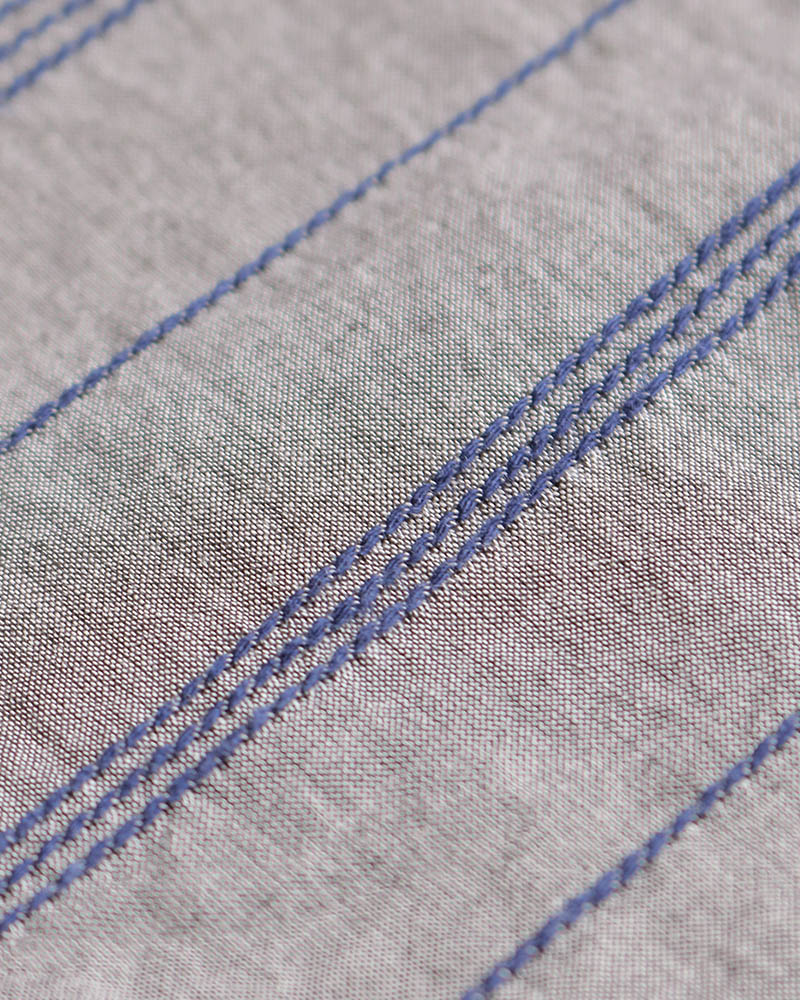 基布には薄手のコットン89%、レーヨン7%、リネン4%、メインはコットンですが若干のレーヨンの滑らかさとリネンのシャリ感を感じ事ができ、ネイビーのステッチが規則的に入ります。