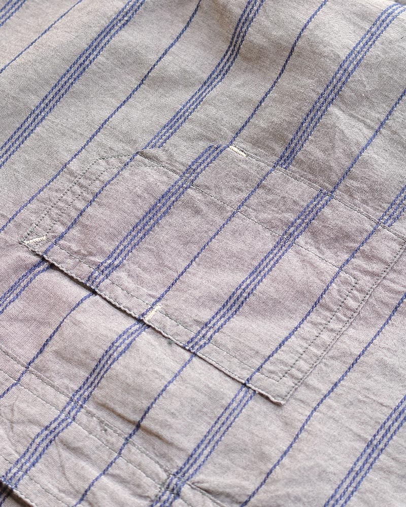 襟腰の低めのバンドカラーで深いグレーの基布、ネイビーのステッチ、全体的にワーク仕様ながら少し上品に大人が着用する一着に仕上がっております。